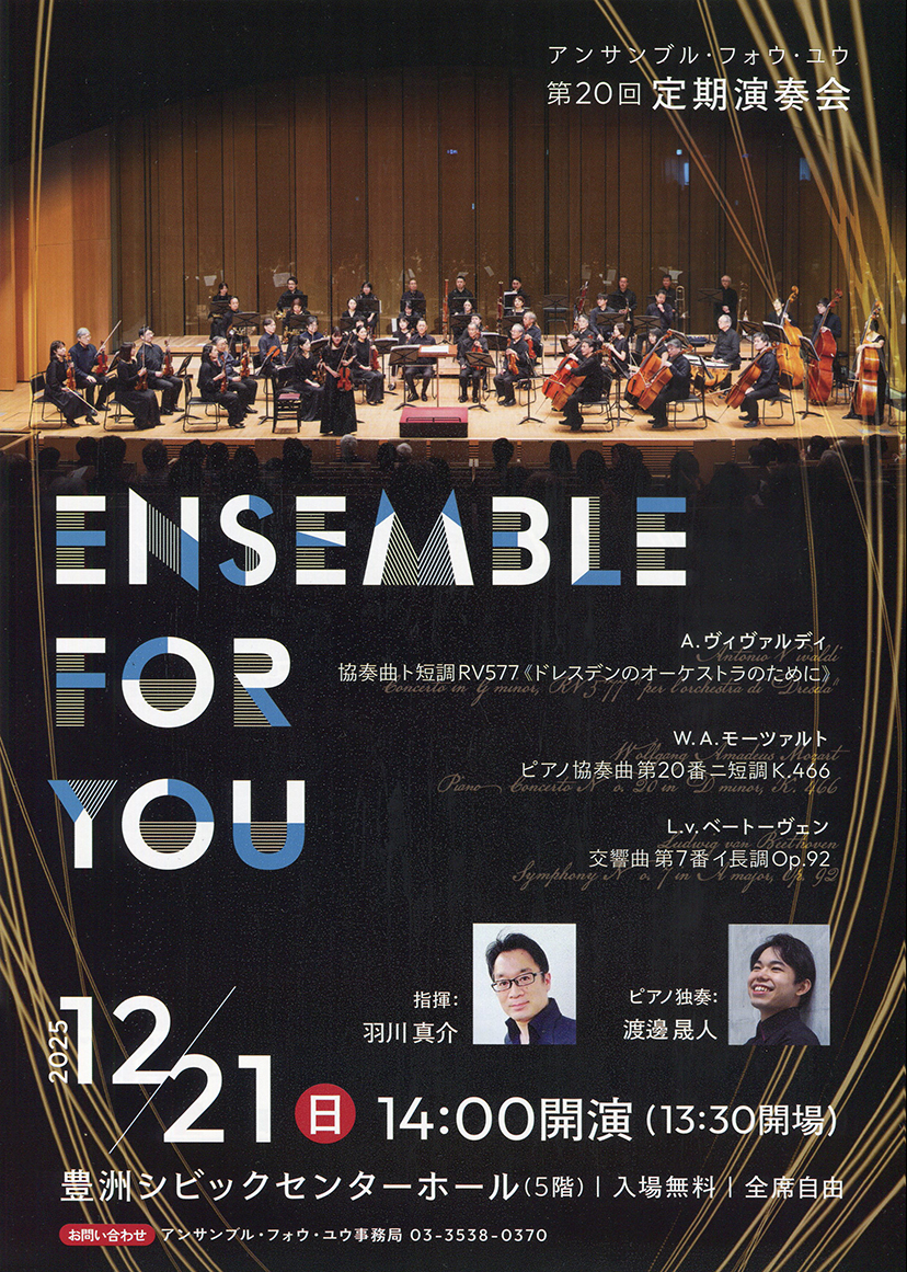 ☆アンサンブル・フォウ・ユウの第20回定期演奏会が 2025年12月21日(日)に豊洲シビックセンターホール(5階) 14;00開演(13;30開場)入場無料 全席自由 にて開催されます
